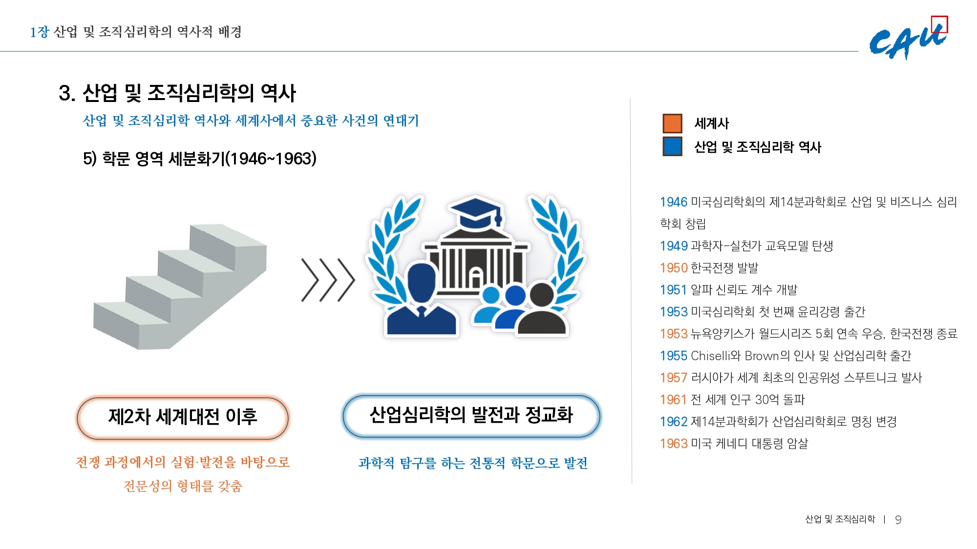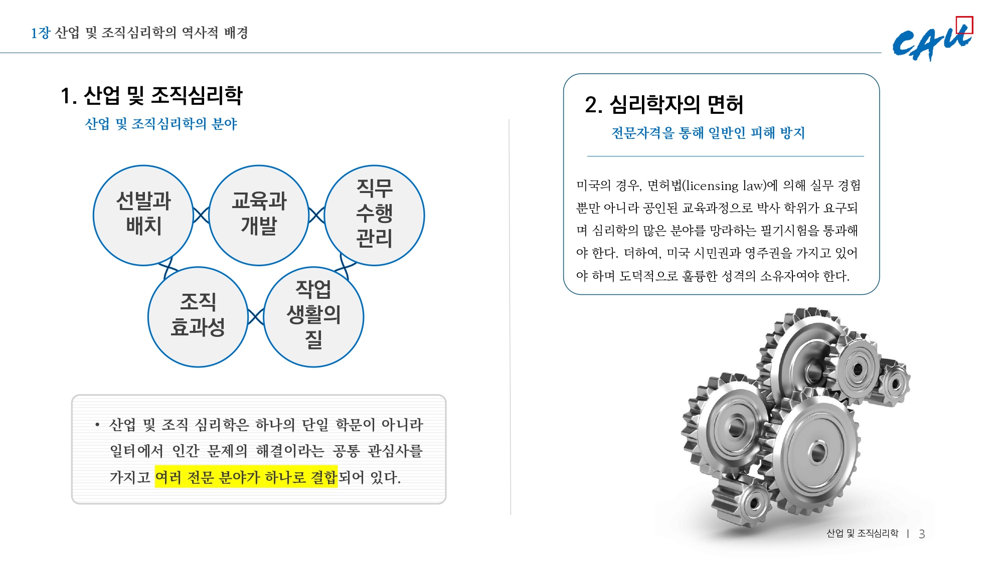 조직 및 산업심리학의 등장 배경, 역사, 범위, 개념, 사회적 역할 그리고 경제 호황 및 불황이 이 분야에 미치는 영향, 인도주의적 산업심리학의 중요성 및 미래과제를 다룬다.