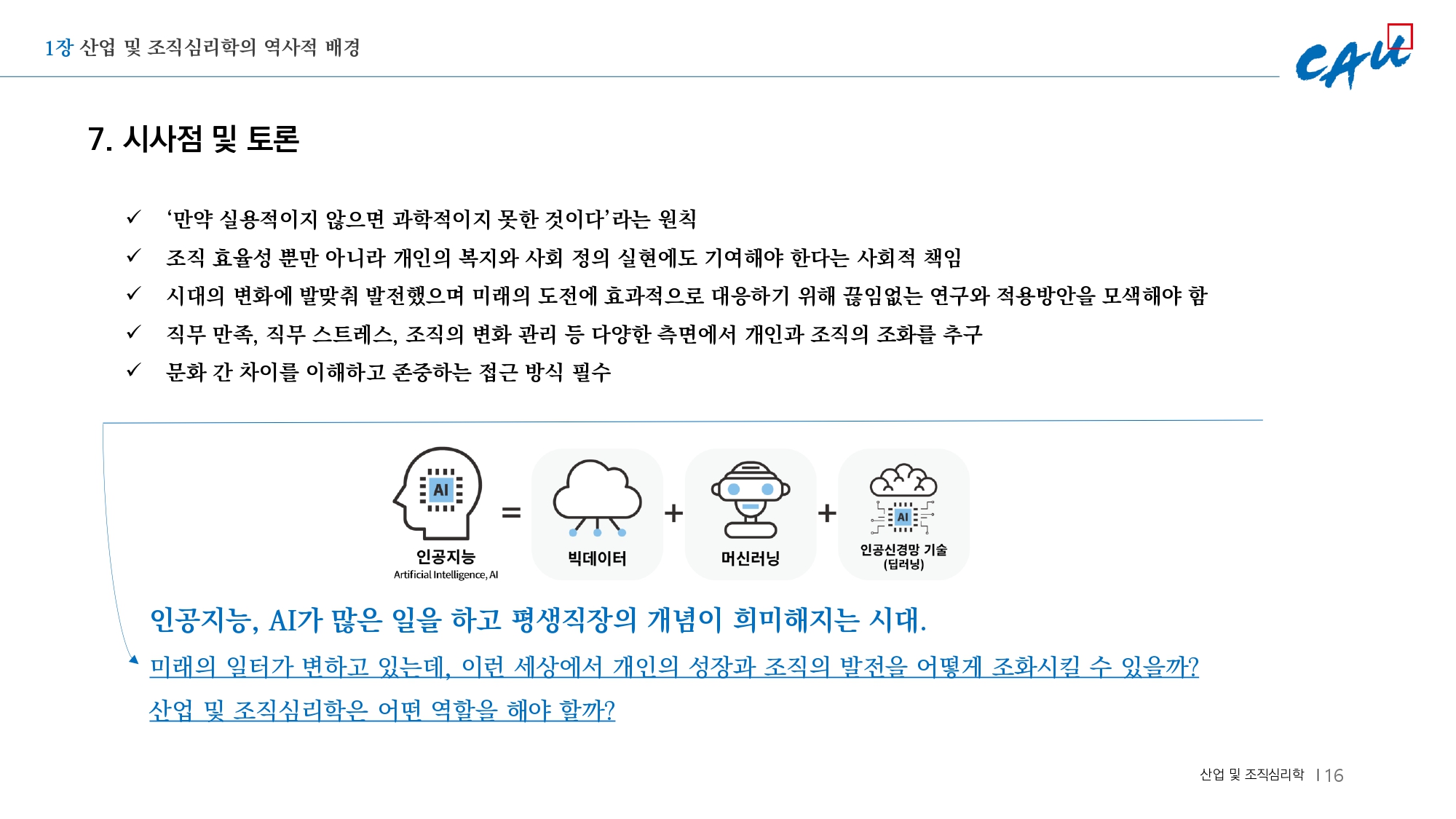 목차와 같이 산업 및 조직심리학의 정의와 학문적 위치를 시작으로 1장을 통해 생각할 볼 수 있는 시사점과 토론주제를 제시하는 것으로 발제를 진행해보겠다.
