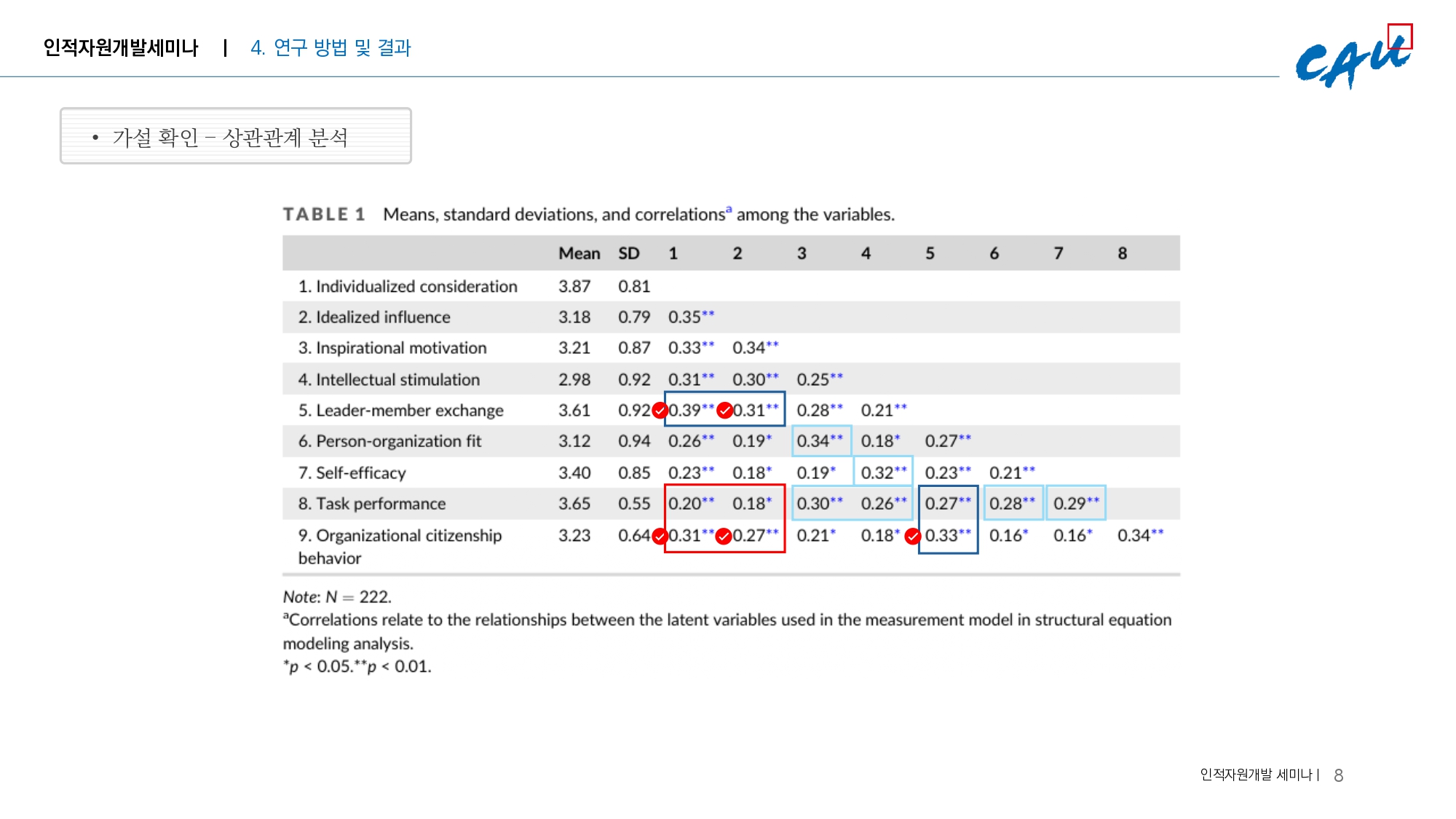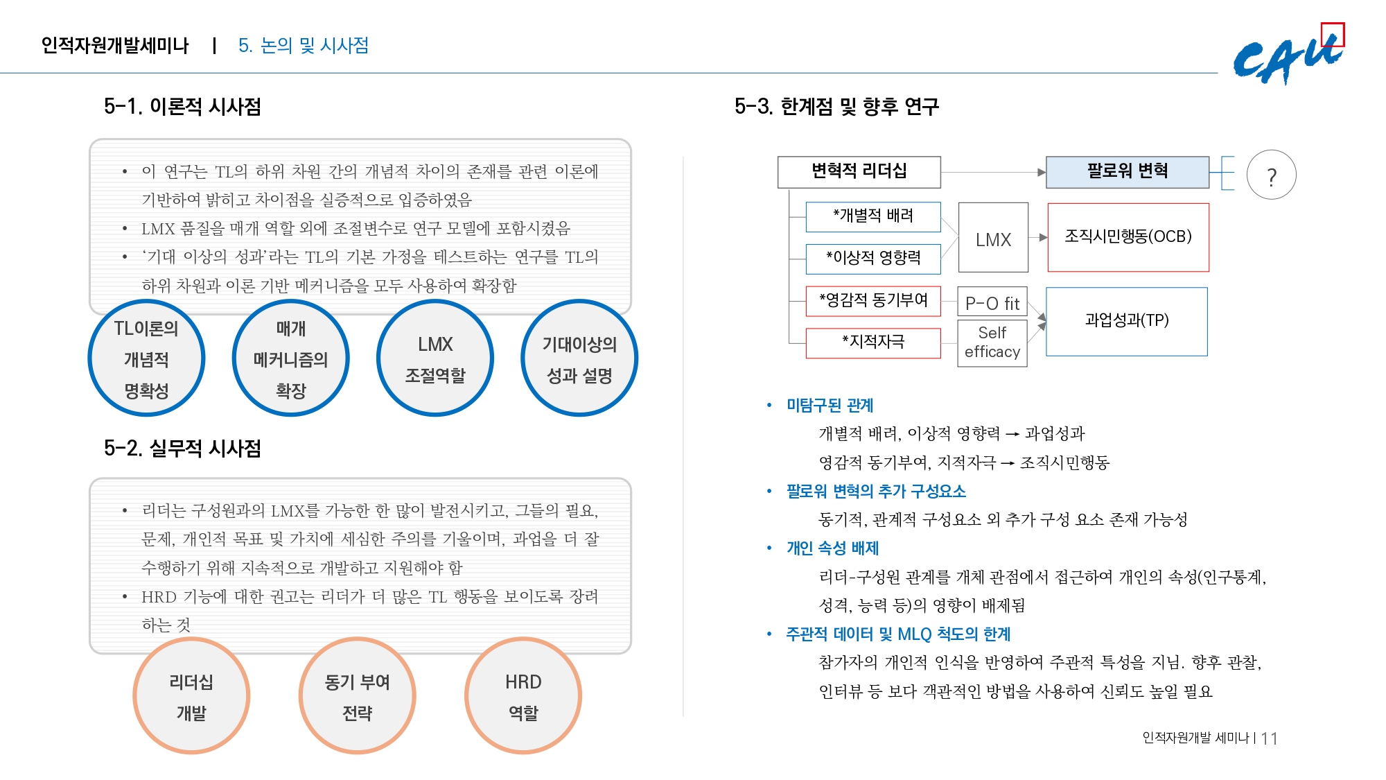 - 개별적 배려, 이상적 영향력과 조직시민행동 간의 관계는 과업성과보다 높게 나타남