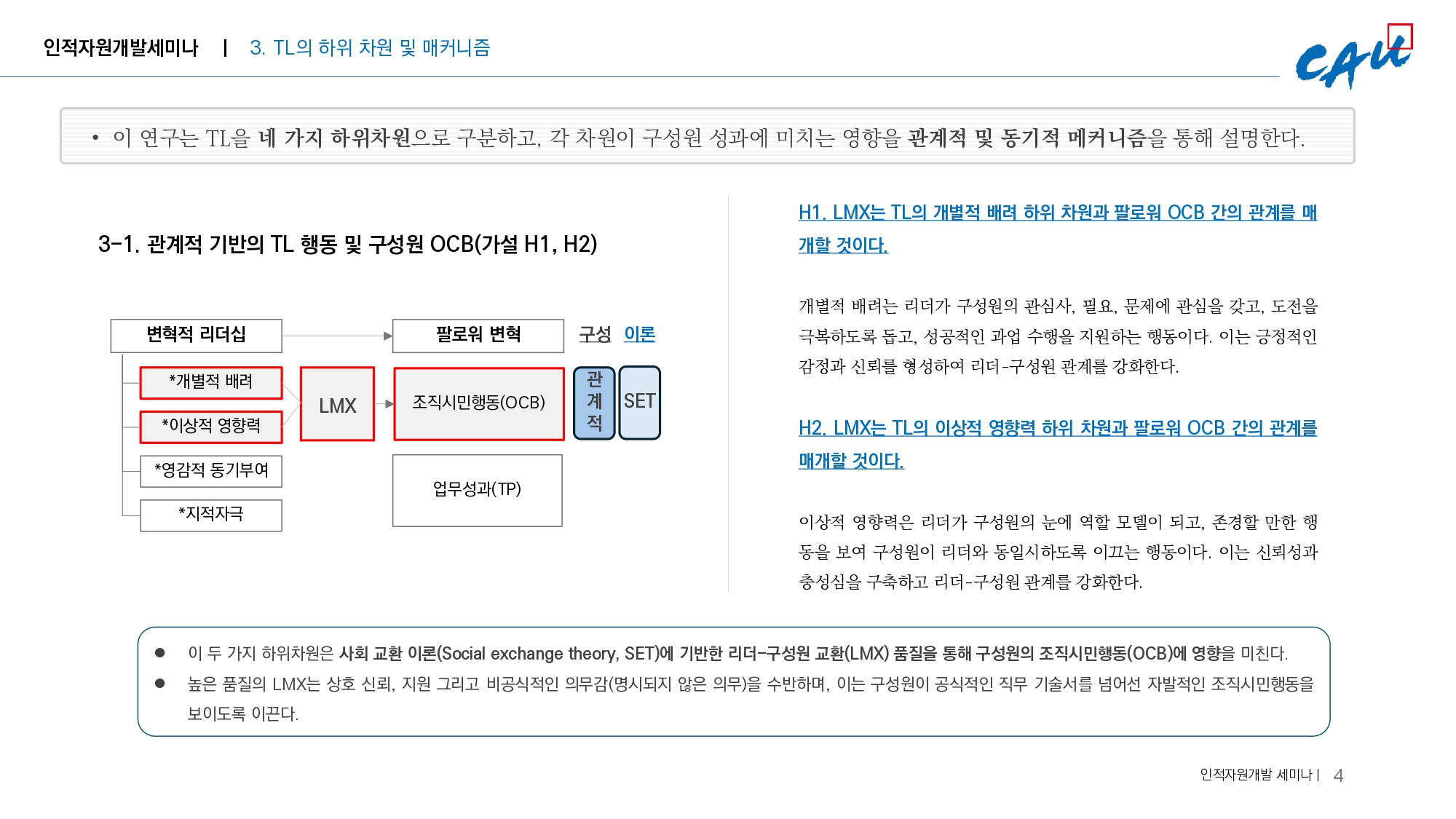- 이는 리더-구성원 교환관계가 변혁적 리더십의 하위 차원과 조직시민행동 사이에서 매개 역할을 한다는 가설에 대한 중요한 초기지표가 됨