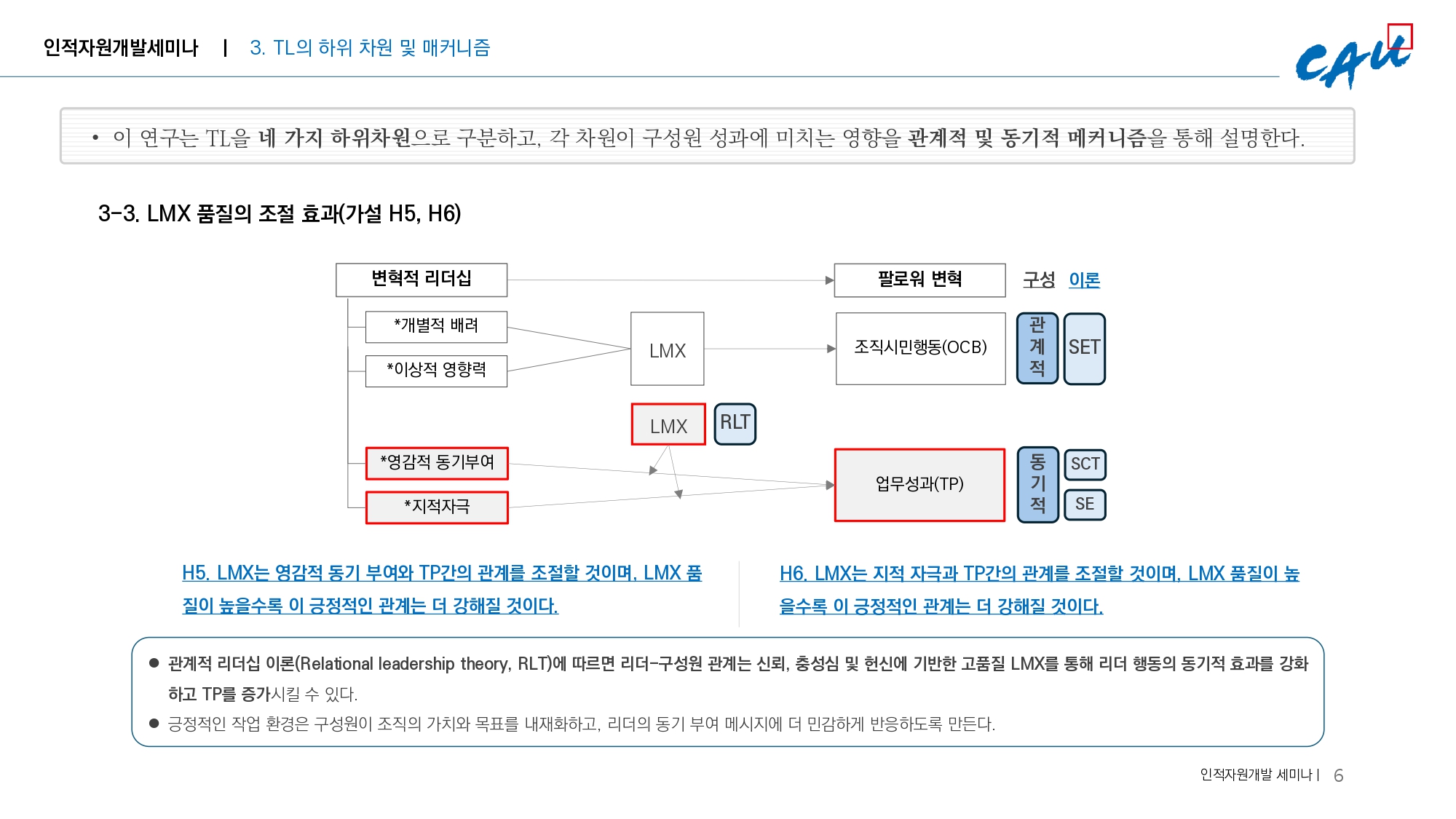 LMX의 품질은 TL의 동기적 효과를 증폭시키는 조절 변수 역할을 한다는 것을 추가적으로 입증하였으며, ‘기대 이상의 성과’가 TL 각각의 하위 차원과 어떻게 밀접히 관계되어 있는지 메커니즘을 통해 설명했다.