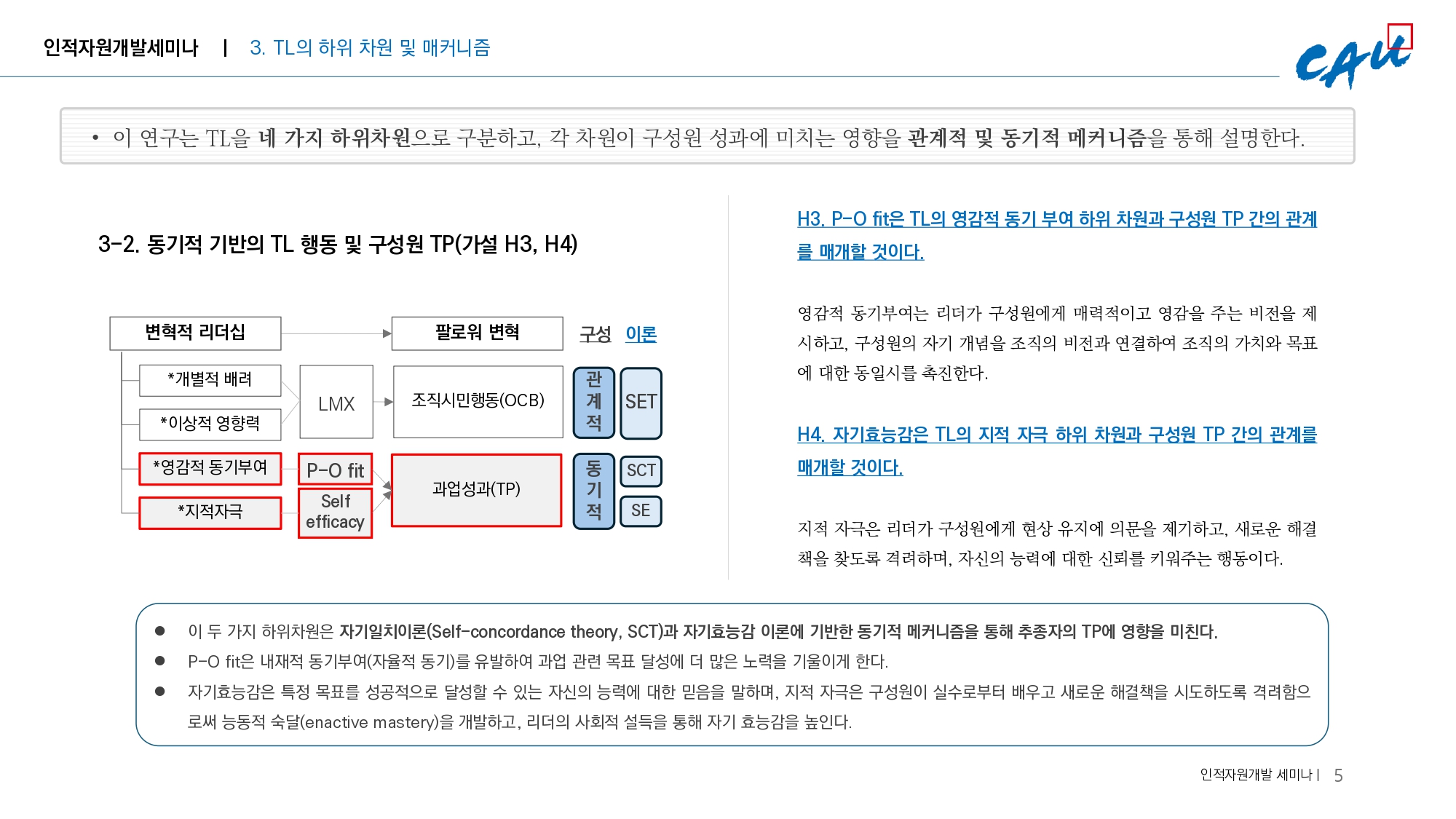 또한 LMX를 유일한 지배적 매개 메커니즘으로 강조하는 기존 연구와 달리, 이 연구는 P-O fit과 자기 효능감을 추가적인 동기적 매개 메커니즘으로 포함하여 TL의 구성원 성과 관계에 대한 이해를 확장했다. 이는 TL의 관계적, 동기적 측면을 모두 고려하는 보다 포괄적인 시각을 제공한다.