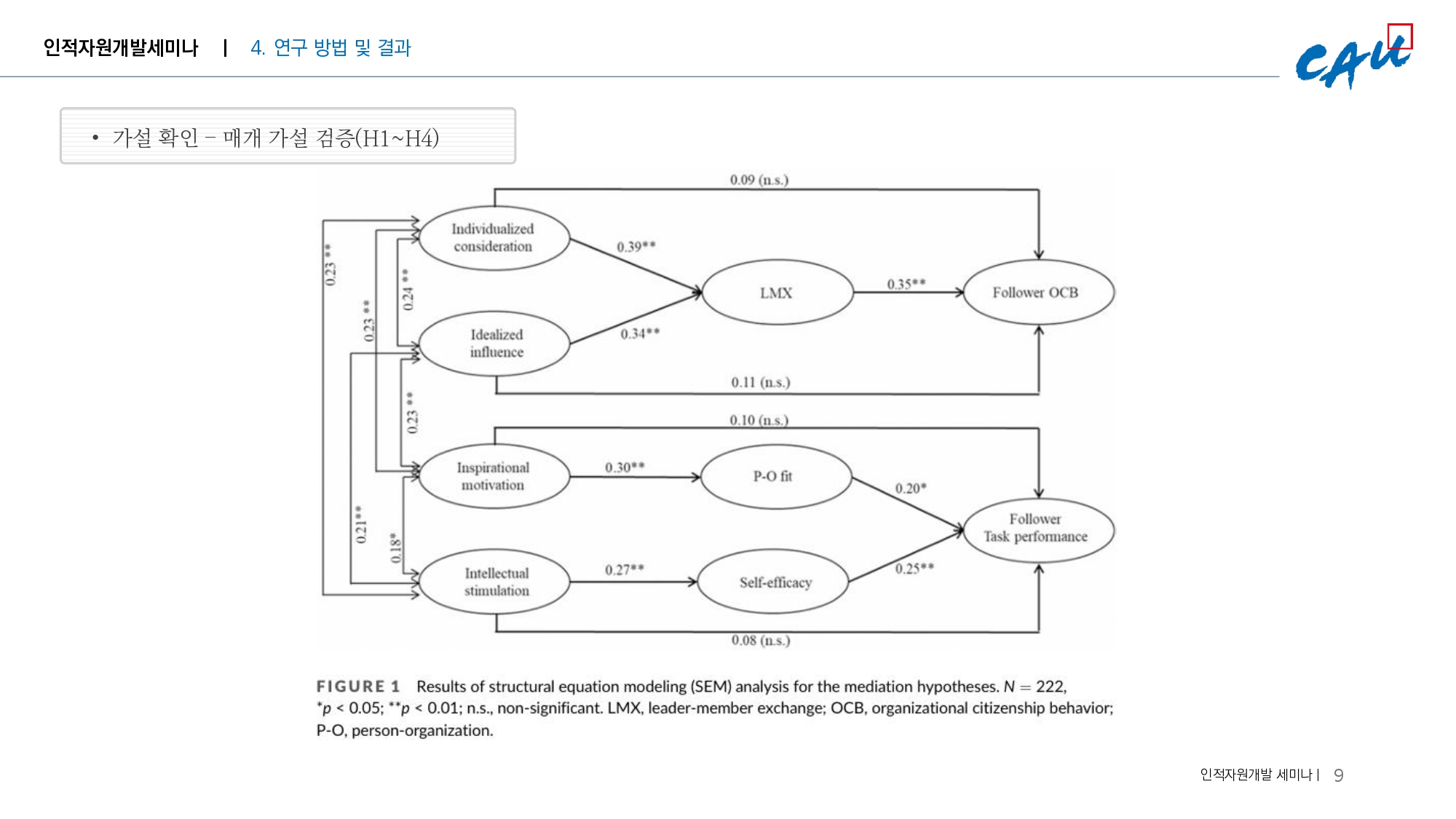 - 이러한 결과는 LMX, P-O fit, 자기 효능감의 완전 매개(full mediating) 역할을 확인했다.