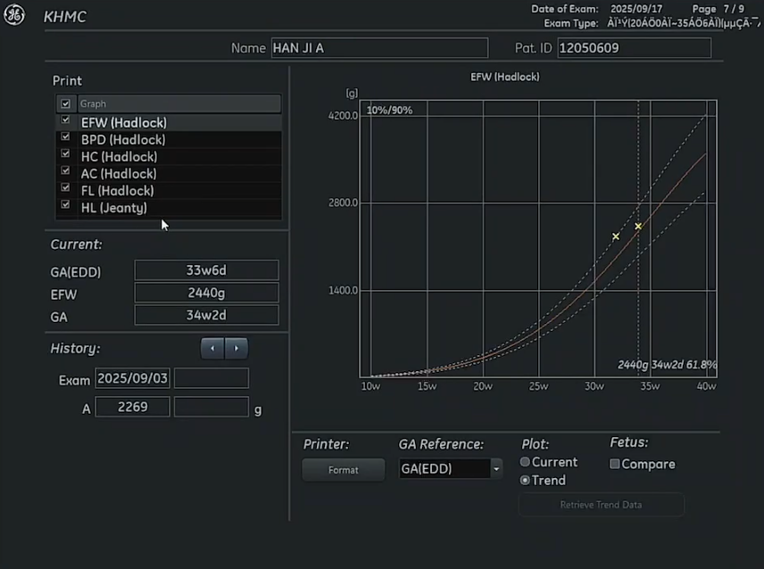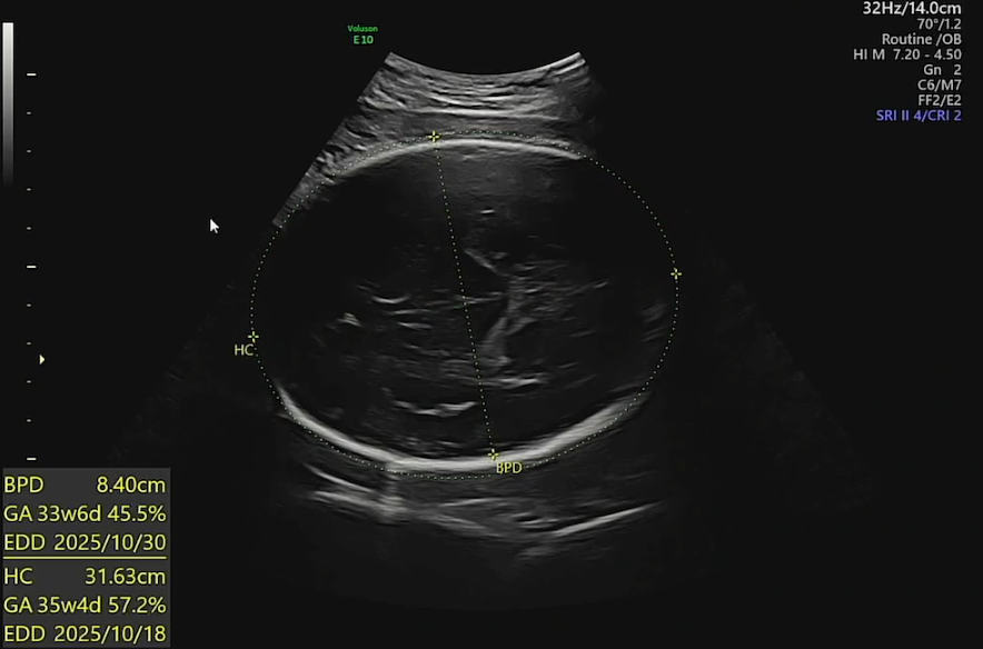 - BPD (Biparietal Diameter, 머리 양쪽 지름): 8.40 cm → 33주 6일 크기, 45.5 percentile
