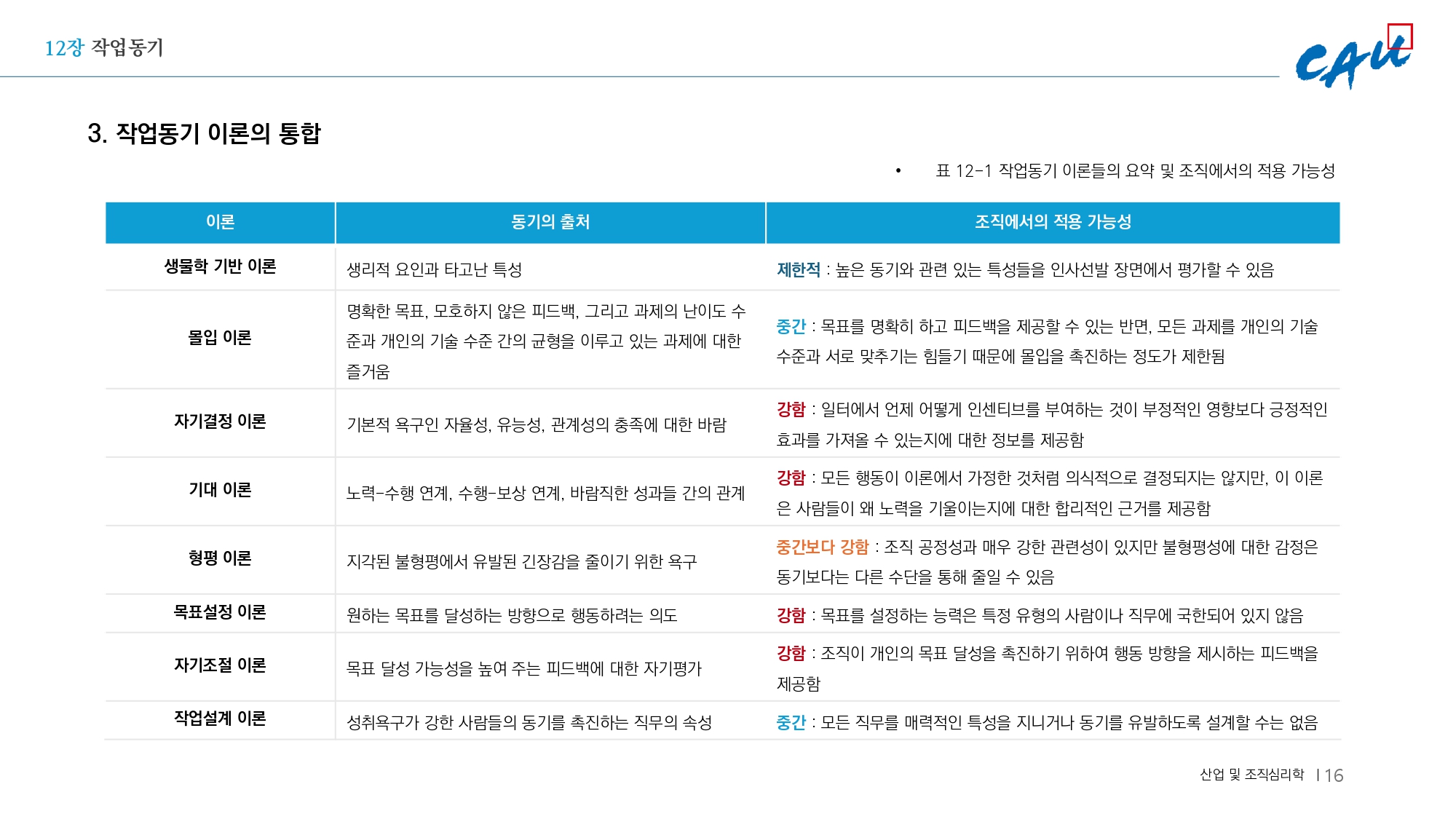 이 표는 다양한 동기 이론들이 선천적인 요인에서부터 의식적이고 통제 가능한 선택에 이르기까지 동기의 원천이 어떻게 다른지 보여준다.