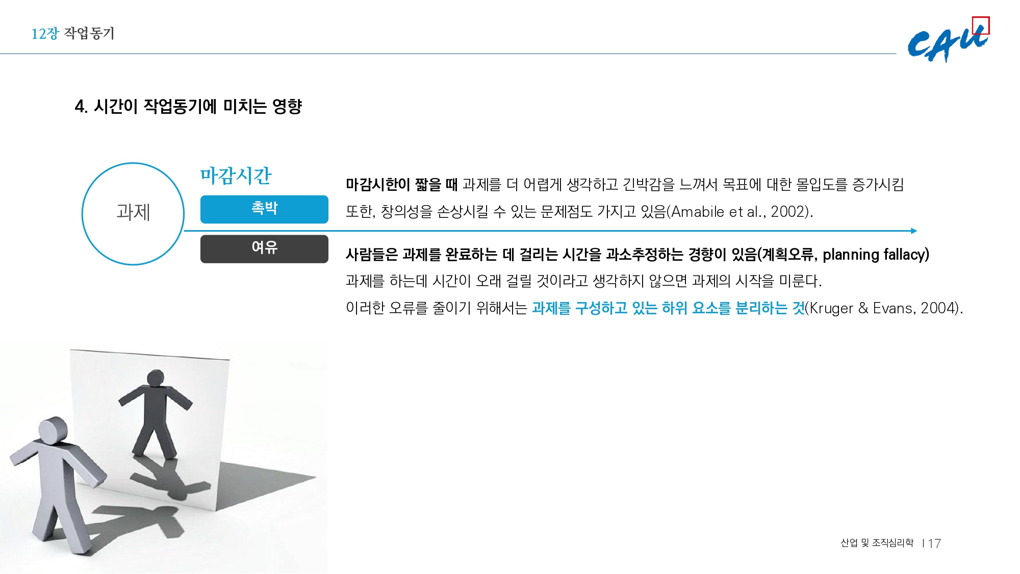 지금과 같이 마감시간이 촉박할 때는 과제를 더 어렵게 느끼고 긴박함 때문에 몰입도가 증가될 수 있지만 창의성을 손상시킬 수 있는 문제도 발생할 수 있다//^^ 반면 사람들은 작업을 완료하는 데 걸리는 시간을 과소평가하는 경향이 있으며, 이는 과제 완수에 필요한 시간을 더 길게 만들 수 있다.