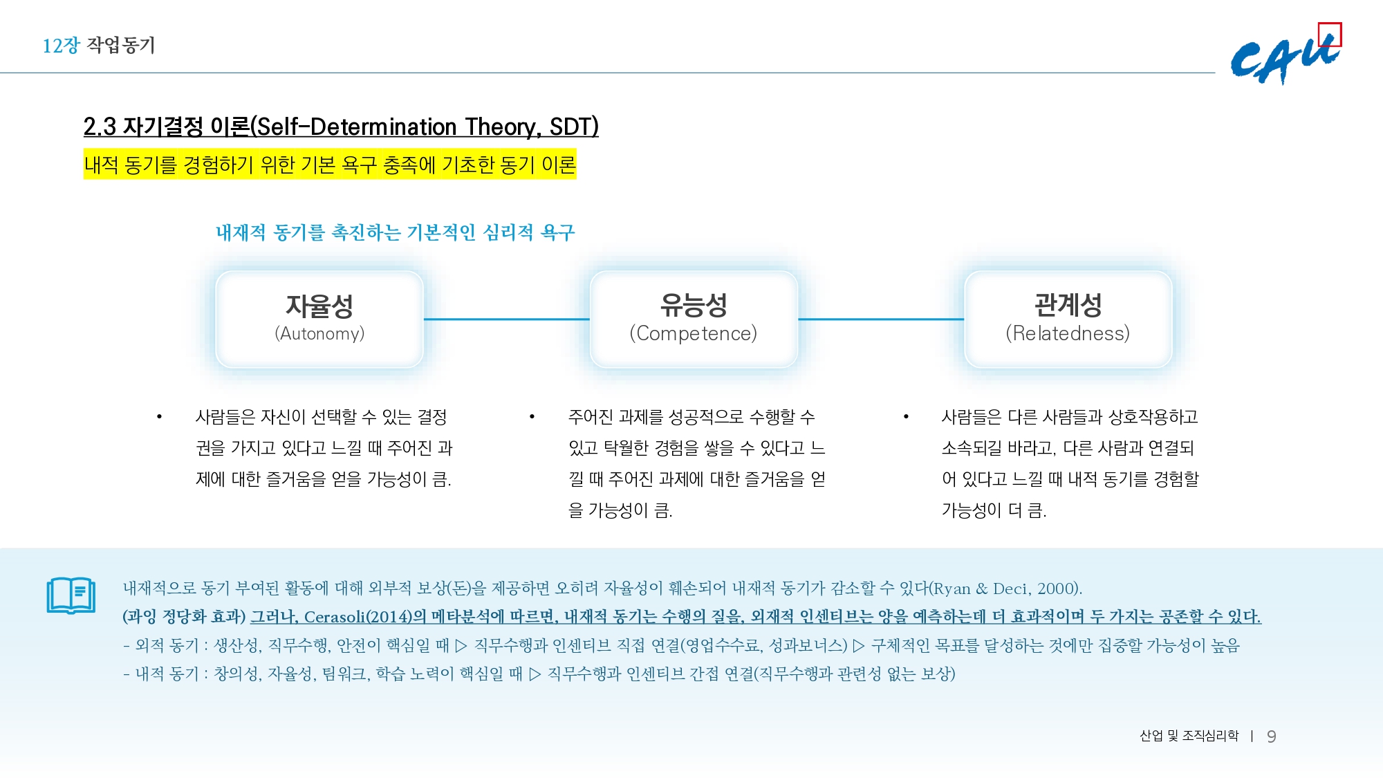 자기결정이론은 내재적 동기를 촉진하는 기본적인 심리적 욕구에 초점이 맞춰져 있다. 이 이론은 세 가지 핵심 욕구를 충족시킬 때 개인이 가장 긍정적이고 효과적인 동기를 갖게 된다고 주장한다.